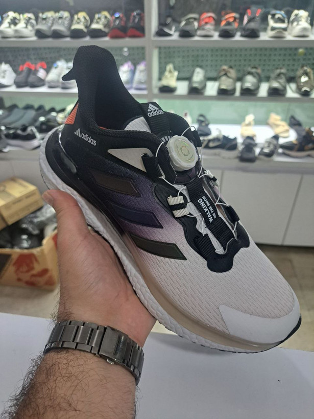 کتونی آدیداس مدل زیپ لاین، یک کفش پیشرفته و حرفهای است که با تمرکز بر عملکرد و راحتی برای پیادهروی و دویدن طراحی شده است. برجستهترین ویژگی این مدل، سیستم بند چرخشی (Dial Lacing System) است که به جای بندهای سنتی، امکان تنظیم سریع، دقیق و ایمن کفش را تنها با چرخاندن یک دکمه فراهم میآورد. این کفش با ترکیب رنگی جذاب سفید، مشکی و سایهروشن بنفش، ظاهری مدرن و اسپرت دارد. رویه تنفسی مِش در پنجه، تهویه عالی پا را تضمین کرده و زیره میانی ضخیم و ارتجاعی آن، ضربهگیری فوقالعادهای را در هنگام حرکت فراهم میکند و برای فعالیتهای طولانیمدت، راحتی بینظیری به ارمغان میآورد.